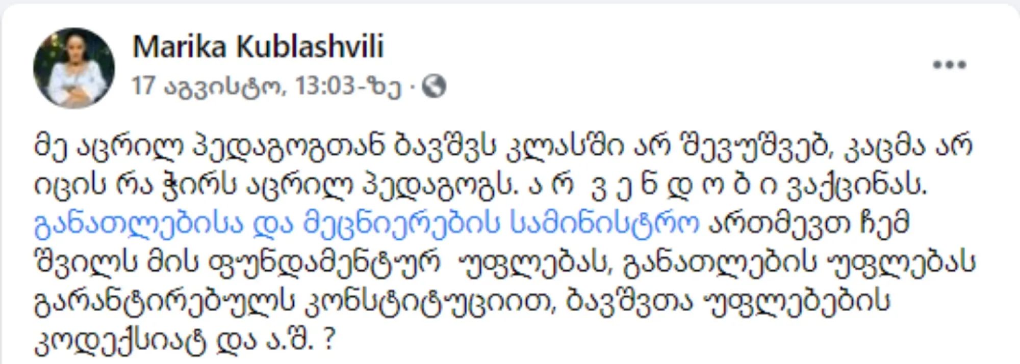„მე აცრილ პედაგოგთან ბავშვს კლასში არ შევუშვებ. კაცმა არ იცის რა ჭირს აცრილ პედაგოგს. ა რ ვ ე ნ დ ო ბ ი ვაქცინას. განათლებისა და მეცნიერების სამინისტრო ართმევთ ჩემ შვილს მის ფუნდამენტურ უფლებას, განათლების უფლებას გარანტირებულს კონსტიტუციით, ბავშვთა უფლებების კოდექსით და ა.შ. ", - წერს მარიკა კუბლაშვილი.