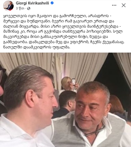 სოციალურ ქსელში მეგობარს საქართველოს ყოფილი პრემიერ-მინისტი გიორგი კვირიკაშვილიც დაემშვიდობა: